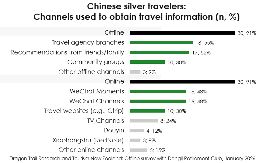 • Offline and online channels were equally important for Chinese silver travelers, with travel agency stores, word-of-mouth from friends and family, WeChat, and travel platforms such as Ctrip being the most influential channels. Notably, WeChat and WeChat Channels were much more influential within this older demographic than newer and trendier platforms like RedNote and Douyin.