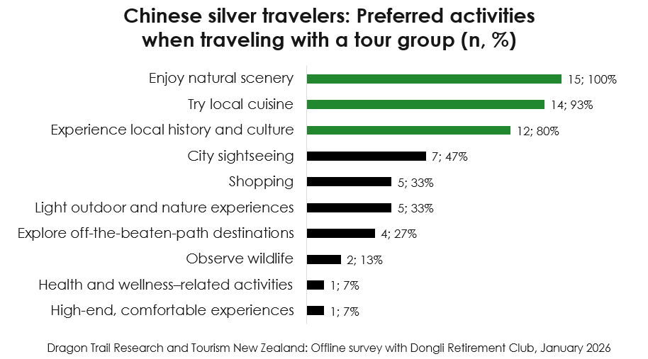 In January 2026, Dragon Trail Research and Tourism New Zealand met with a group of 34 Chinese silver travelers in Shanghai, recruited in cooperation with Dongli Retirement Club, the largest organization in Shanghai specializing in serving middle-aged and elderly consumers. We used this offline session to conduct a survey of 10 questions about travel habits and preferences, as well as experience and expectations about travel to New Zealand.