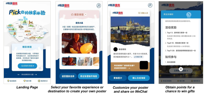 Face Fusion is just one way to allow users to create personalized images. Many other campaigns use H5 campaign pages to allow users to generate customized posters by uploading their own photos or choosing from an image database. In April 2022, Dragon Trail helped Czech Tourism to launch the interactive campaign: “Create your own travel story in Czech” (pictured, above). The campaign invited users to explore a Czech map on a specially developed H5 campaign page, then select their favorite spots for their next trip, and generate a customized poster and share with their WeChat contacts. Those users that contributed the most to the exposure of the campaign through creating and sharing posters, were awarded points that could be exchanged for gifts.
