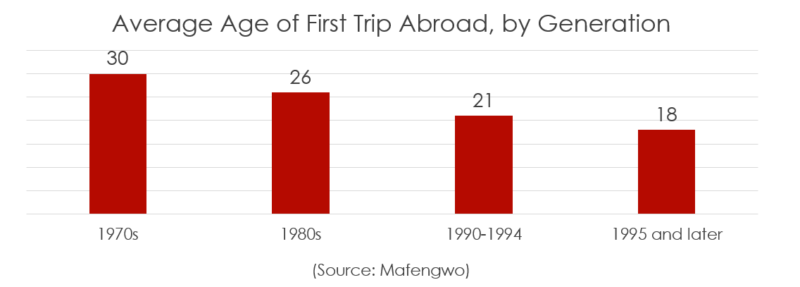 Because of the extraordinary growth in China’s outbound travel market from the end of the 1990s until the pandemic, that meant that the younger the generation, the earlier the average age when they first traveled outside of China. And not only were younger travelers traveling overseas earlier, they were also traveling more often. So this generation has had a head start in becoming experienced as travelers.