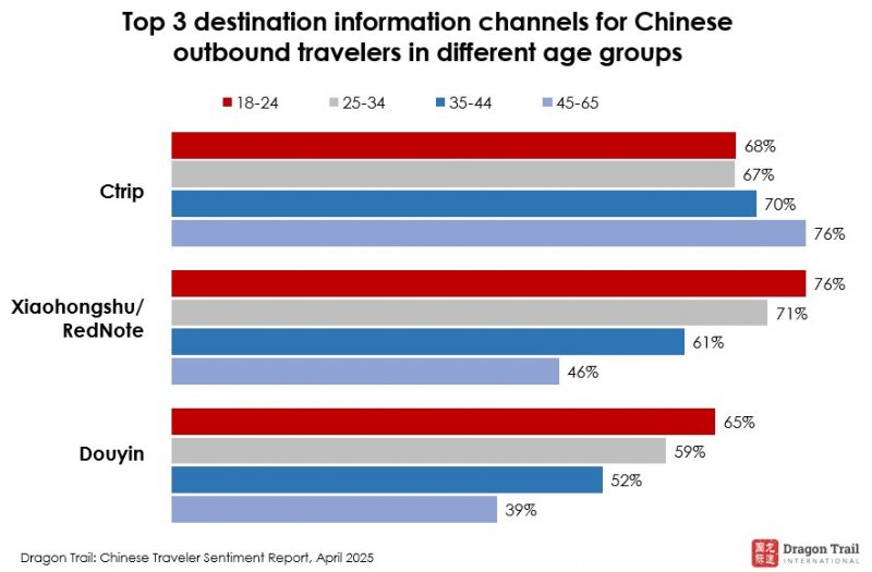 Chinese app RedNote continues to dominate for travel inspiration and planning. But RedNote wasn’t called RedNote until 2025 – while the app is already more than 10 years old, it previously went by Red, Little Red Book, or its Chinese name, Xiaohongshu. The name RedNote was introduced in January 2025 when Xiaohongshu suddenly became the most-downloaded app in the US, with around half a million American users joining before a scheduled ban on TikTok. The TikTok ban has still never gone into effect, and the buzz around RedNote outside of China died down quickly, but this brief incident definitely put RedNote – or Xiaohongshu – on the radars of more marketers outside of China. At the same time, the app became more important than ever for Chinese travelers. In Dragon Trail’s spring consumer survey, it was second only to Ctrip as a source of outbound travel destination information, and it was the top information source for travelers under the age of 35.