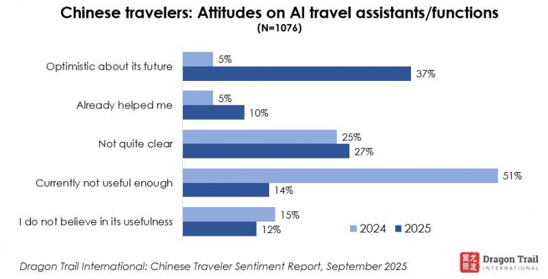 Finally, we can’t talk about trends and developments in 2025 without mentioning AI, and this is especially true for China and its travel market. China’s DeepSeek introduced its chatbot in 2025, and this proved to be a catalyst. All of the top Chinese OTAs released or updated their own AI tools for consumers in the first few months of the year, many of them integrated with DeepSeek, and Singapore became the first outbound destination to launch an AI trip planner tool for the Chinese market, together with Mafengwo. Chinese travel attitudes toward AI tools changed dramatically – our surveys showed a very significant decline the proportion of survey respondents who think AI isn’t yet helpful for travel, from 66% down to 26%, while those who are optimistic about the technology rose from 5% to 37%, and the proportion of those who said it AI had already helped them with travel doubled.
