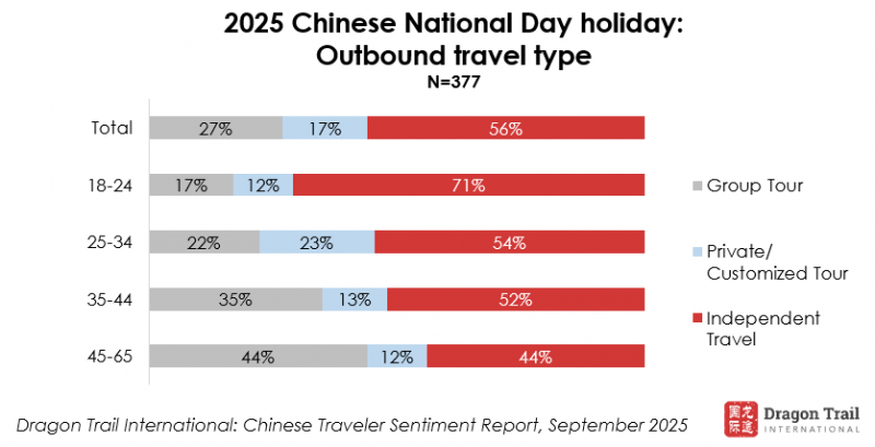 The rise of independent travel was on our list of top Chinese outbound tourism trends in 2024, and has been a defining market trend for the past decade. We now have more than half of Chinese travelers who planned an outbound trip this October saying they planned to travel independently, and just 27% opting for a group tour – this preference for FIT is even more pronounced among younger generations, with 71% of those aged 18-24 traveling independently.
