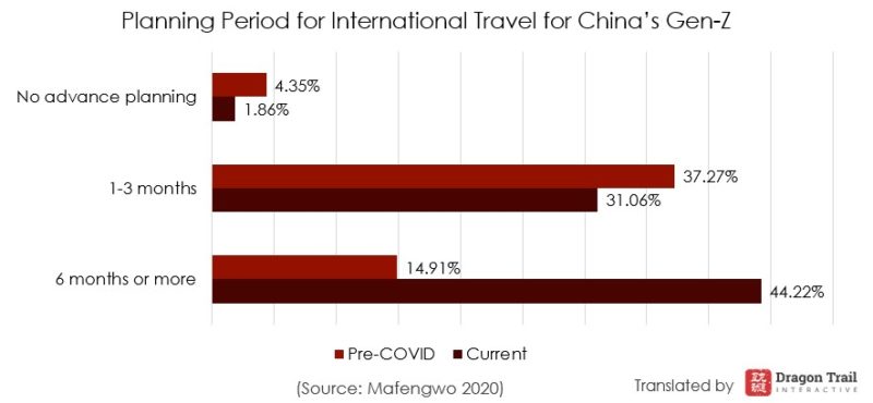 In comparison, Gen-Z’s attitude to travel overseas is very wary. According to the report, most young people would now plan at least a half a year in advance before traveling overseas. Those who would travel abroad spontaneously have fallen from 4.35% to just 1.86%. These findings don’t just reflect current attitudes, but current realities – with most parts of the world still not open to international tourism arrivals, limited flights, temporary closure of visa centers and other obstacles, it is only logical that travelers will need more time to make travel plans.
