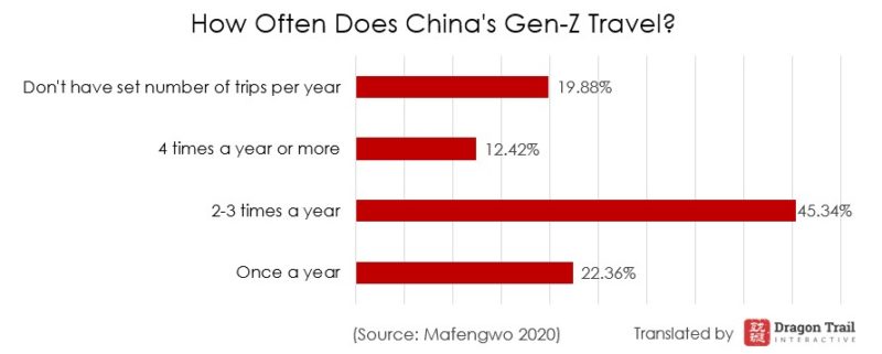 Compared to the generation of travelers before, Gen-Z’s travel is more frequent, with 45.34% traveling two or three times a year, and 12.42% traveling four or more times every year. These numbers are much higher than other age groups.