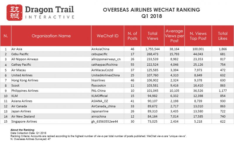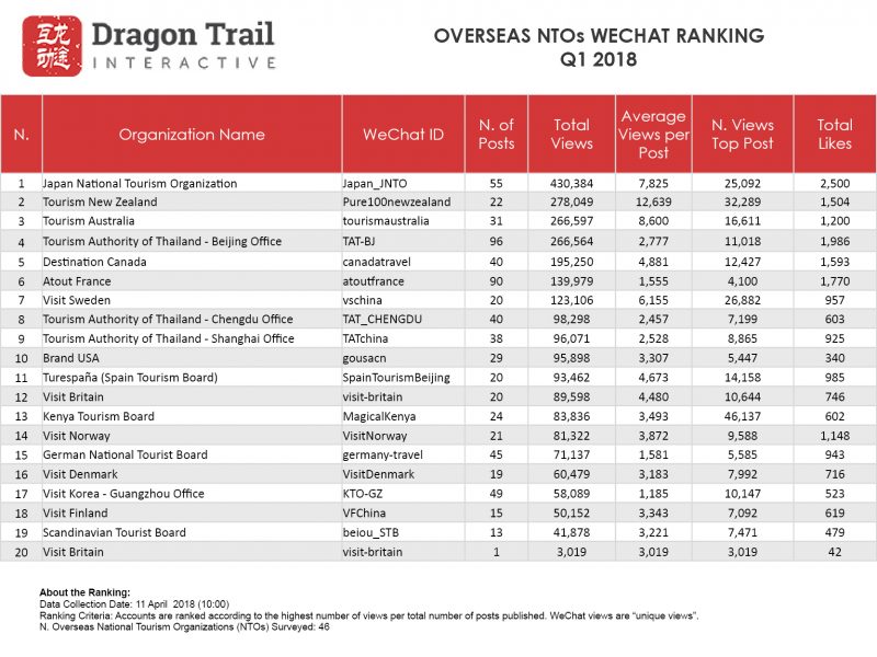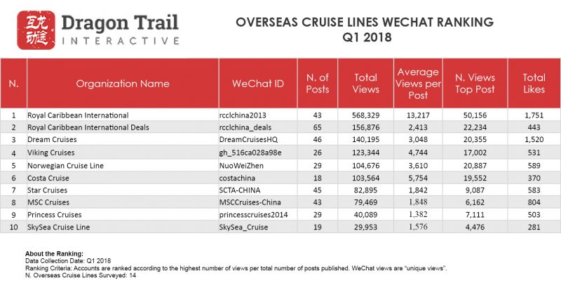 Now in their second year, Dragon Trail’s weekly WeChat rankings for the travel industry track official WeChat accounts for international destinations, cruise lines and airlines. From the end of Q1 2018, we have added two new categories – hotels and attractions & museums – and the first quarterly report to include these will be available in July.