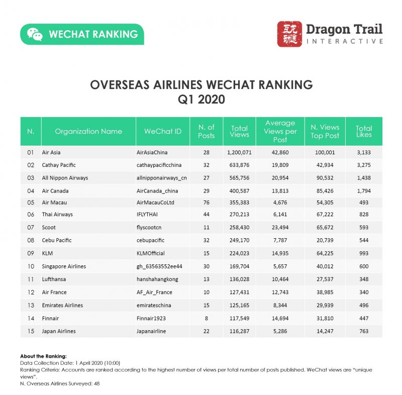 The leading airline accounts for the quarter – AirAsia, Cathay Pacific, and All Nippon Airways – can often be seen at the top of the WeChat rankings. Air Canada ranked in 4th for the quarter, which is the first time in nearly two years (since Finnair in Q2 2018) that a non-Asian airline has ranked in the top five for a quarter, and the highest ranking for the Canadian airline in our three years of quarterly reports. Air Canada got 85,426 views for its 26 January post on free changes to ticket bookings from mainland China, compared to just 18,478 views for its most-read article of 2019.