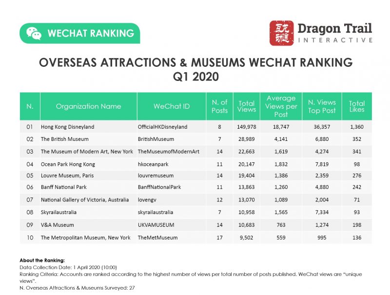Museums and Attractions is the one category of overseas WeChat accounts where we saw a significant drop in the average number of views per post – a 28.8% decline compared to Q1 2019, and a 15% decline compared to 2019 as a whole. Accounts posted an average of 10.2 times during the quarter, down from 13.4 posts in Q1 2019, and 27.6 posts per quarter for 2019 on average.