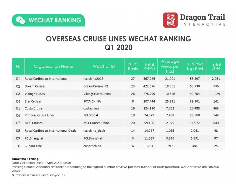Chinese travelers may be wary of taking any international cruises at present, but they have been much more engaged with cruise lines’ content on WeChat during this crisis period. International cruise lines posted less than half as much content in Q1 2020 compared to Q1 2019 (160 articles vs. 385 articles), but the average views per post were up by 73.7%.