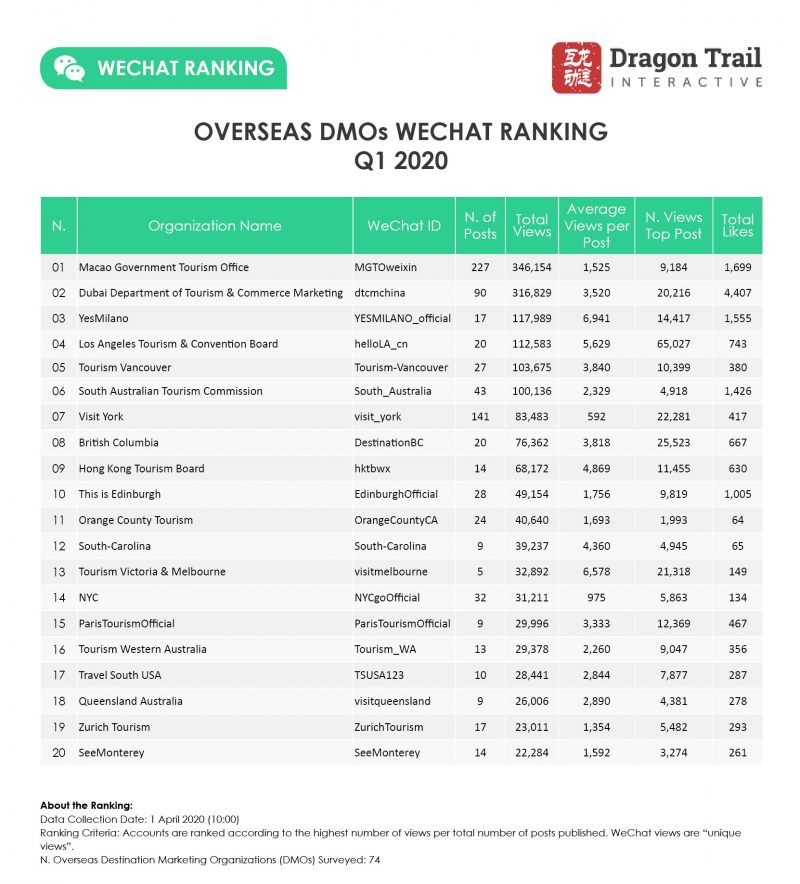 Dragon Trail’s WeChat Rankings Report for Q1 2020 examines and analyzes the performance of six categories of travel brands on WeChat: national tourism organizations (NTOs), destination marketing organizations (DMOs, referring to regional and municipal tourism boards), airlines, cruise lines, museums and attractions, and hotels. With the coronavirus crisis erupting from China just at the start of the important Chinese New Year tourism season at the end of January, this quarter was significantly different for Chinese tourism from any we have analyzed since the start of 2017. However, despite the sudden drop in Chinese tourism, readership of tourism brands’ content actually rose for most categories and leading accounts during this period, highlighting WeChat’s importance as a communications platform.