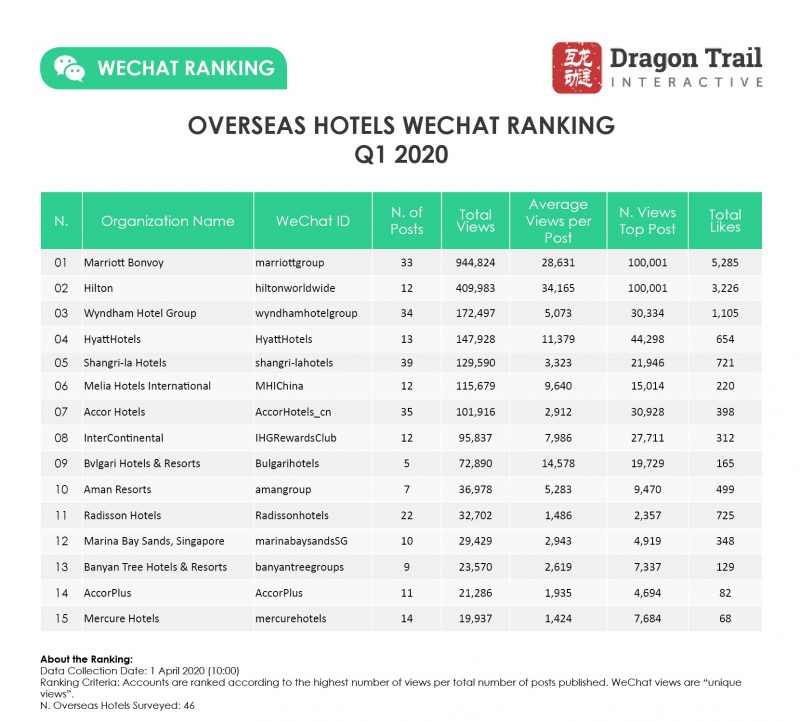 Another thing that stands out is that in all of 2019, the most-read WeChat article by an international hotel brand got 83,315 views – in Q1 2020, both Marriott and Hilton posted articles that surpassed the 100,000-view mark. Those articles were Hilton’s end-of-January announcement that cancellation fees for bookings in Wuhan would be waived, and Marriott’s mid-February article explaining that elite status and members’ points would be extended for all of Greater China.