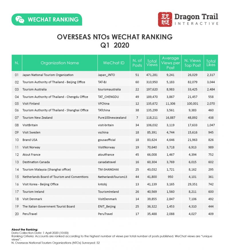 At a time of increasingly reduced outbound travel from China, readership of NTOs’ WeChat content did not see a significant decrease. The average views per post for all active NTO accounts in Q1 2020 (3,122) were actually 1.6% higher than the average views per post for all of 2019 (3,073) and only 5.8% lower than Q1 2019 (3,314). While Japan dropped from an average of 10,647 views per post in Q1 2019 to 9,241 views per post in Q1 2020 (a 15.2% decrease), Thailand’s Beijing account increased average views per post by 75.5% year on year. New Zealand’s average views per post were up by 40% compared to Q1 2019, and Australia’s increased by 62.2%.