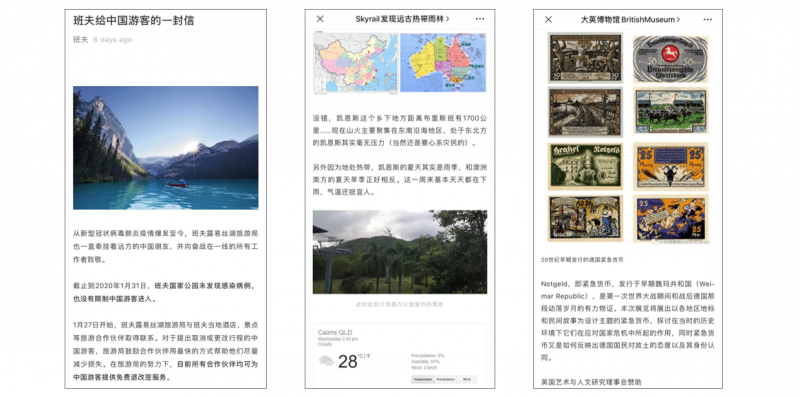 Some of the most-viewed WeChat posts by attractions in Q1 2020 include (left to right): Banff National Park’s letter to Chinese visitors; Skyrail Australia’s informational post on the bushfires; and the British Museum’s 2020 exhibition lineup