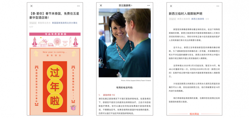 Q1 2020’s most-viewed WeChat posts by national tourism boards (left to right): A Chinese New Year giveaway from the Tourism Authority of Thailand; information on emergency contacts and health services from Visit Finland; and an announcement on a travel ban from mainland China by Tourism New Zealand