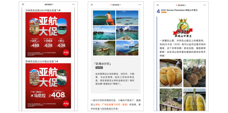 AirAsia promoted flights to Southeast Asia with low prices, water activities, and local food