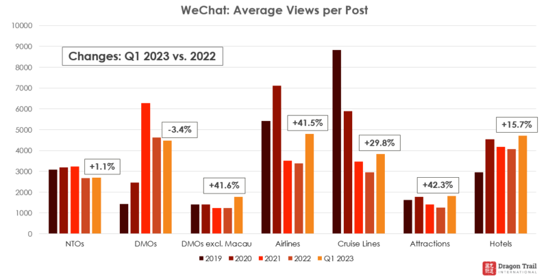 Comparing the first quarter of 2023 with the data from 2022, we generally see a very significant increase in the average views per article published on WeChat. This increase is still fairly small for NTOs, at only 1.1%, and readership numbers have not recovered to pre-pandemic levels yet. For DMOs, when we look at the category as a whole, average views have actually gone down by 3.4% compared to last year. But this is caused by just one account – Macau. If we take Macau’s account out of the picture, the average views for articles in the DMO category is much smaller, but there’s an increase of more than 40% compared to the 2022 average. Similarly, airlines are up by 45.1%, cruise lines around 30%, attractions more than 42% and hotels nearly 16%.