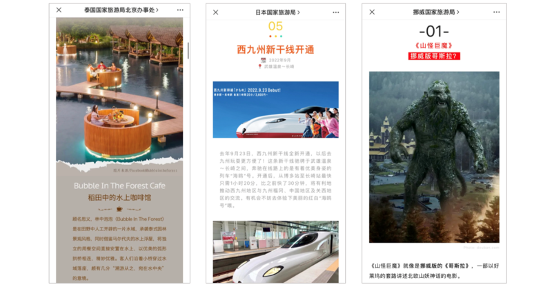 Most top WeChat articles for NTOs were practical entry guides, but other popular content included a guide to cool cafes in Thailand, new attractions in Japan, and the Norwegian film Troll