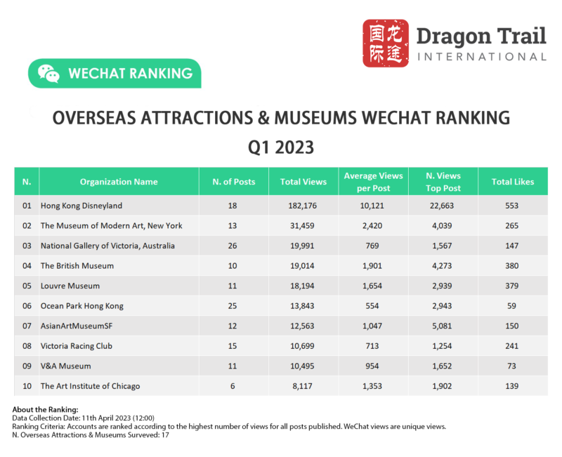 Dragon Trail’s WeChat Rankings Report for Q1 2023 examines and analyzes the performance of six categories of travel brands on WeChat: national tourism organizations (NTOs), destination marketing organizations (DMOs, referring to regional and municipal tourism boards), airlines, cruise lines, museums and attractions, and hotels.