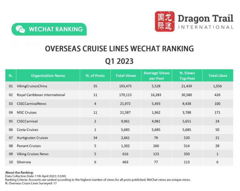 The top articles from Royal Caribbean International were about discounts on October holiday cruises in Europe, and fly cruises from Singapore. The cruise line also promoted South America and New Zealand. Meanwhile, Viking Cruises attracted views with discounted European river cruises, and an announcement about the resumption of China Merchants cruises from Shanghai and Shenzhen to Japan, starting 18 April 2023.