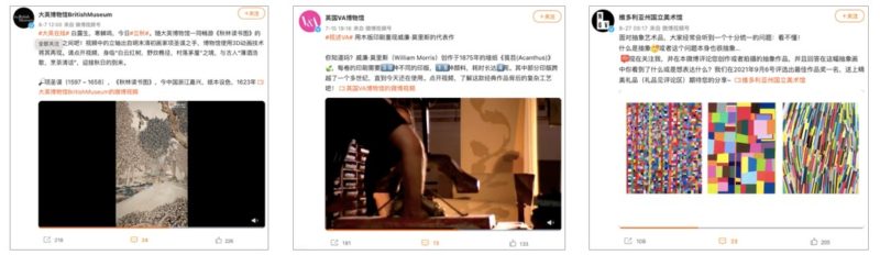 Left: The British Museum’s 3D animation of a Chinese painting; Middle: V&A Museum on block printing with William Morris’ design; Right: The National Gallery of Victoria on interpreting abstract art.