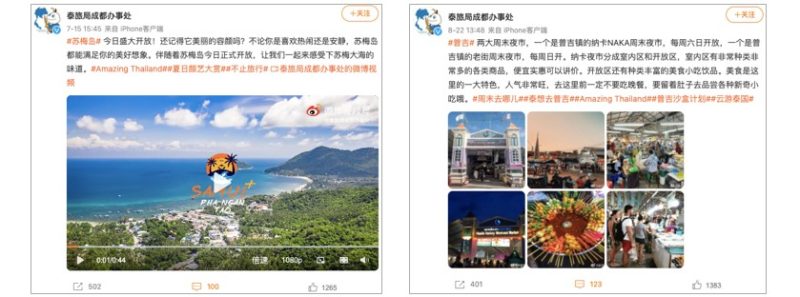 Tourism Authority of Thailand – Chengdu Weibo posts on the opening of Samui (left); and weekend night markets in Phuket (right)