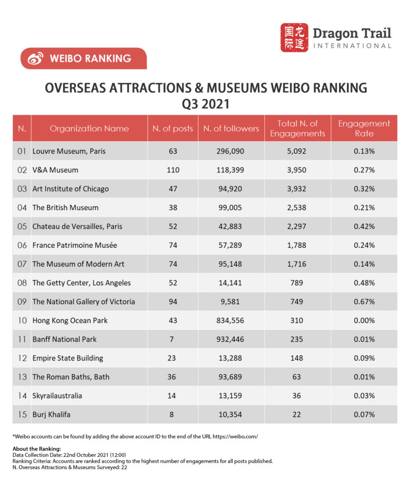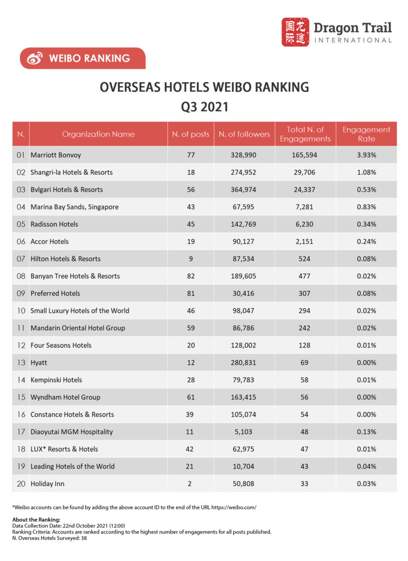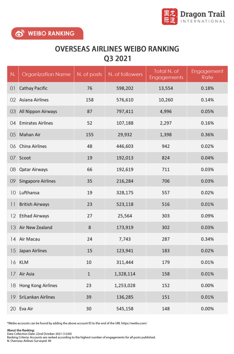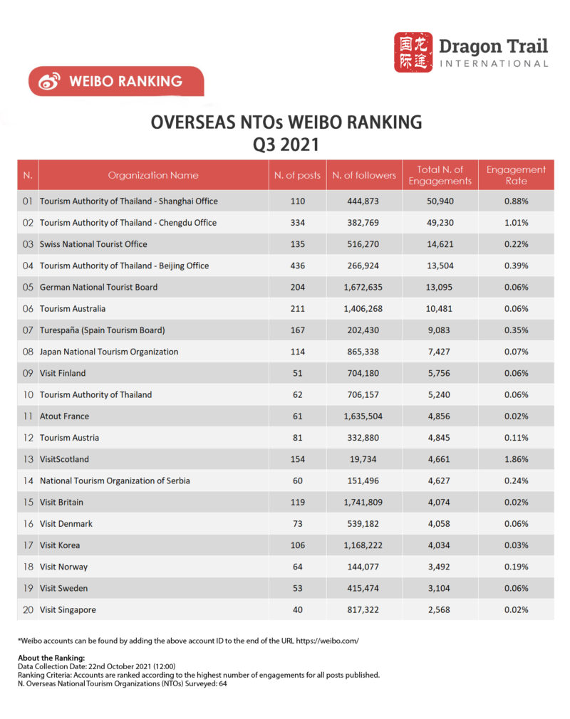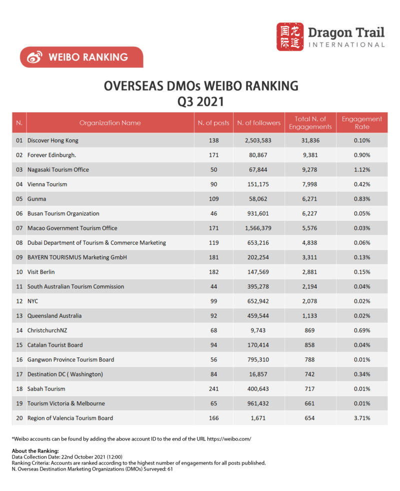 Dragon Trail International’s Weibo Rankings Report tracks and analyzes performance for national tourism organizations (NTOs), destination marketing organizations (DMOs), airlines, cruise lines, museums & attractions, and hotels. Like the weekly rankings reports, the quarterly report builds industry benchmarks and uncovers best practices in digital marketing in the travel sector.