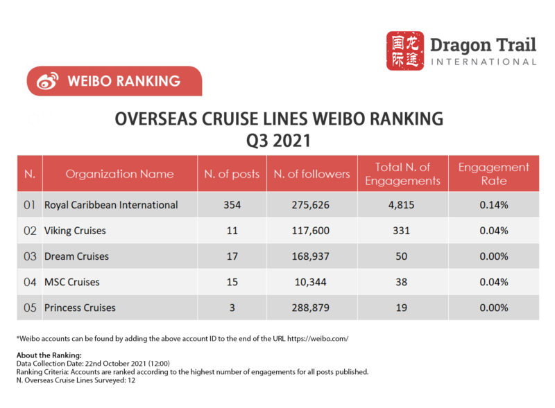 Seven cruise accounts were active in Q3, the same as in Q2. The cruise category has seen a decline in both followers and engagement levels over the past quarter. The posts with the most engagement were giveaways during the Mid-Autumn Festival, which led to growth in engagement rate for Viking Cruises.
