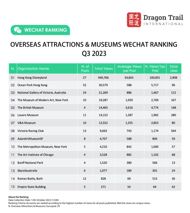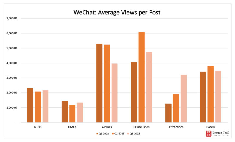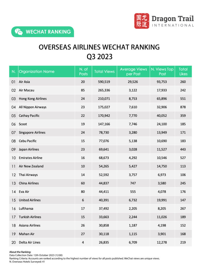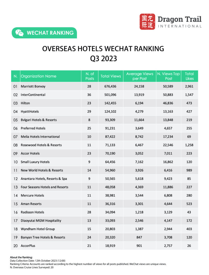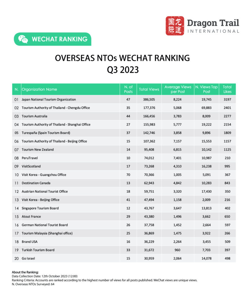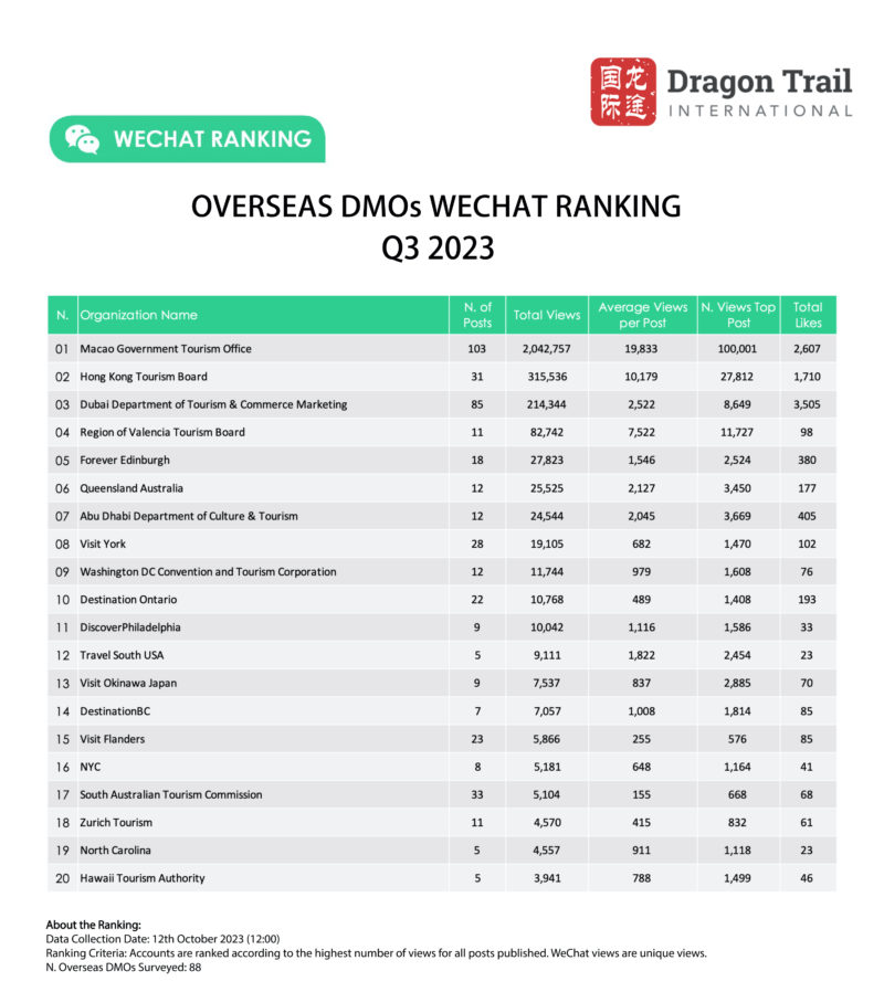 Dragon Trail’s WeChat Rankings Report for Q3 2023 examines and analyzes the performance of six categories of travel brands on WeChat: national tourism organizations (NTOs), destination marketing organizations (DMOs, referring to regional and municipal tourism boards), airlines, cruise lines, museums and attractions, and hotels.