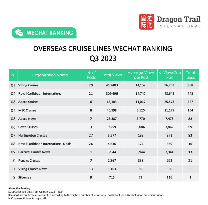 The majority of readership in cruise line content was driven by Viking Cruises and Royal Caribbean International, amassing 410,403 and 309,696 total views, respectively. Viking’s readership nearly doubled compared to the previous quarter, with its top article reaching 96,203 views. The most popular article discussed the launch of a new cruise route for winter 2023, targeting travelers seeking exotic visa-free exploration. This 8-day cruise journey connects Shenzhen with Vietnamese destinations like Halong Bay and Danang before concluding in Hong Kong, while also highlighting attractions and experiences in these locations.