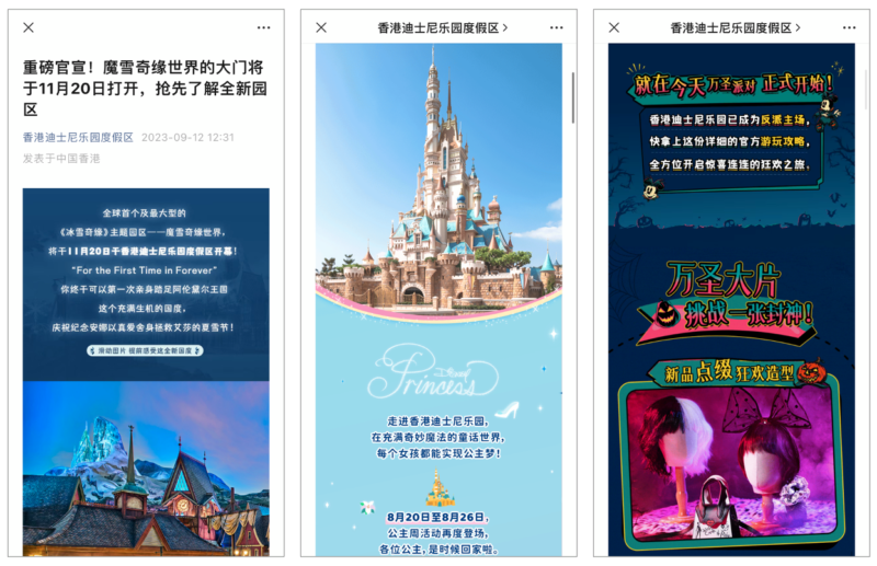 (Left to right) Opening of Frozen-themed park, “Princess Week” at Hong Kong Disneyland, and Halloween celebration