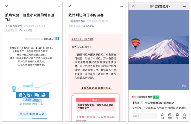 (Left to right) The resumption of flights connecting China to Japan, travel insurance recommendations for Chinese tourists planning their trips to Japan, and the full opening of group tours from China to Japan