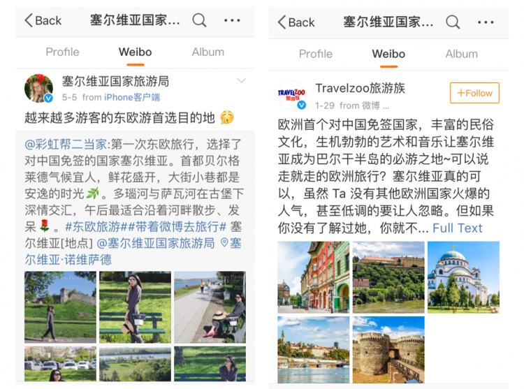 Content re-posted on the Serbian tourism board’s Weibo account. Both the post by travel blogger ‘Rainbow faction’ and Travel Zoo mention that Serbia is visa-free in the first sentence.