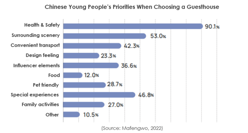 The most important priority for Mafengwo users when choosing accommodation is very clearly health and safety, chosen by more than 90% of survey respondents. The next highest priorities are the surrounding scenery and special experiences. The report explains that a growing number of guesthouses offer activities like fruit picking, murder mystery games, or hot springs, to enrich the travel experience.