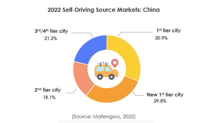 According to Mafengwo data, 60.7% of self-driving travelers are from first- and new first-tier cities. 80.7% of self-driving trips last from 1-8 days, and the most popular itineraries tend to be in western China, including Sichuan, Tibet, Gansu, and Xinjiang. An ongoing trend, content relating to RV/campervan travel on Mafengwo increased by 30.3% year on year in 2022.
