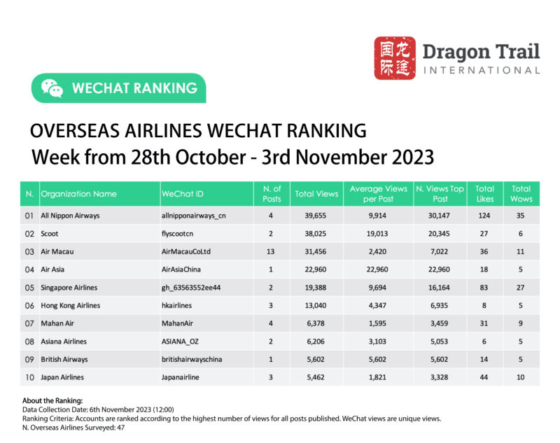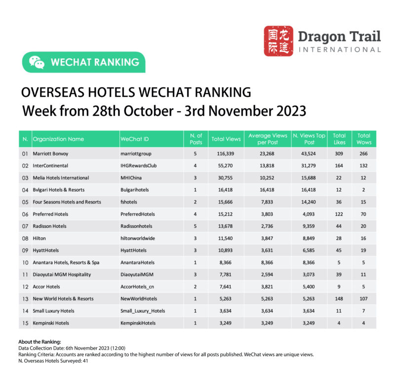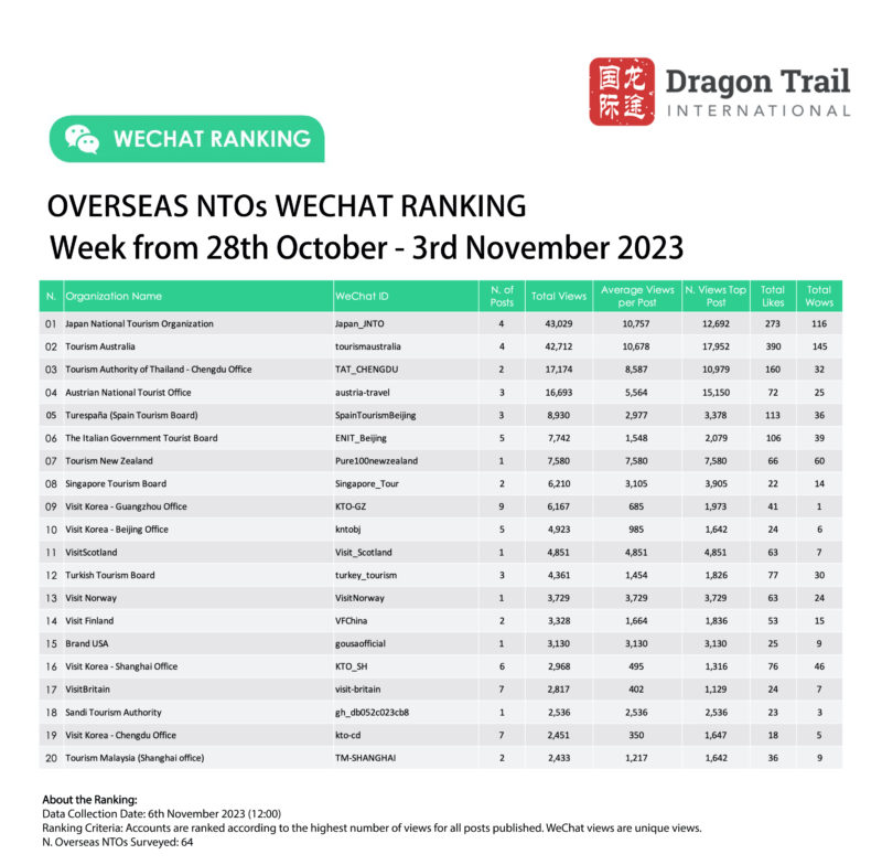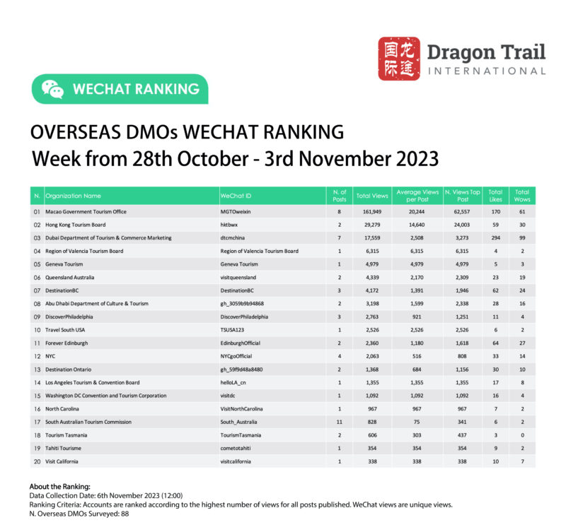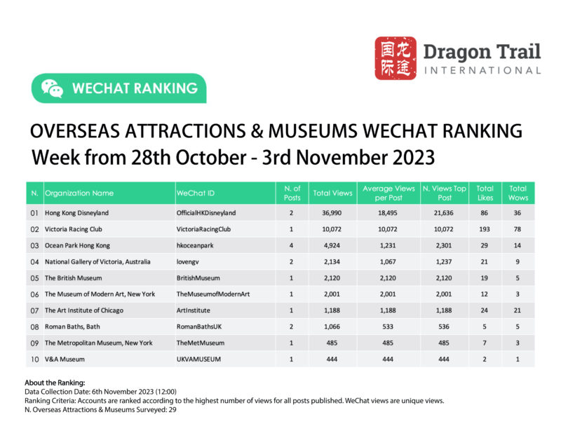 The top-ranking WeChat accounts for travel destinations, airlines, cruise lines, museums & attractions, and hotels, for the week of 28 October-3 November 2023.