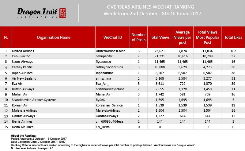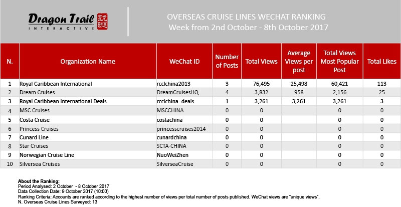 WeChat Weekly Ranking- Destinations, Airlines and Cruises – Week 2 October – 8 October