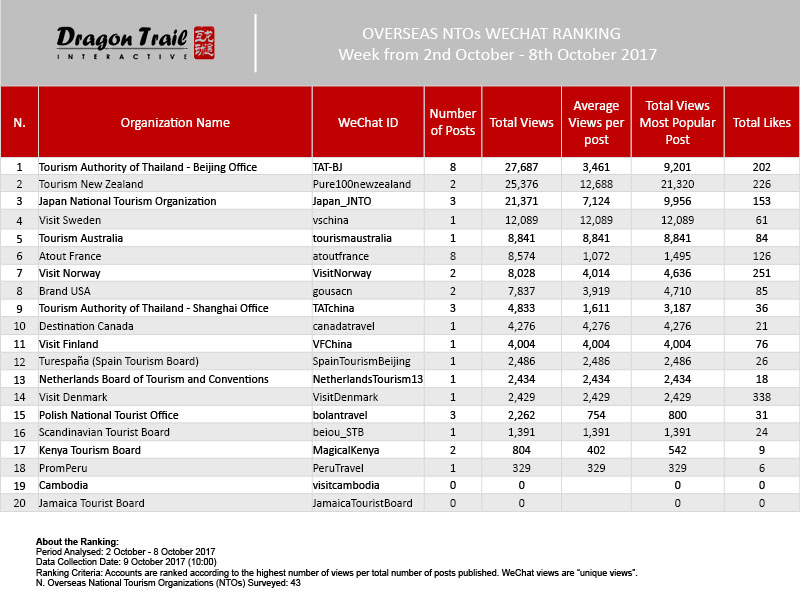 The data is jointly collected and compiled by Dragon Trail Interactive and Dingla, a B2B travel marketing platform assisting foreign organizations build long term travel trade relationships in China.