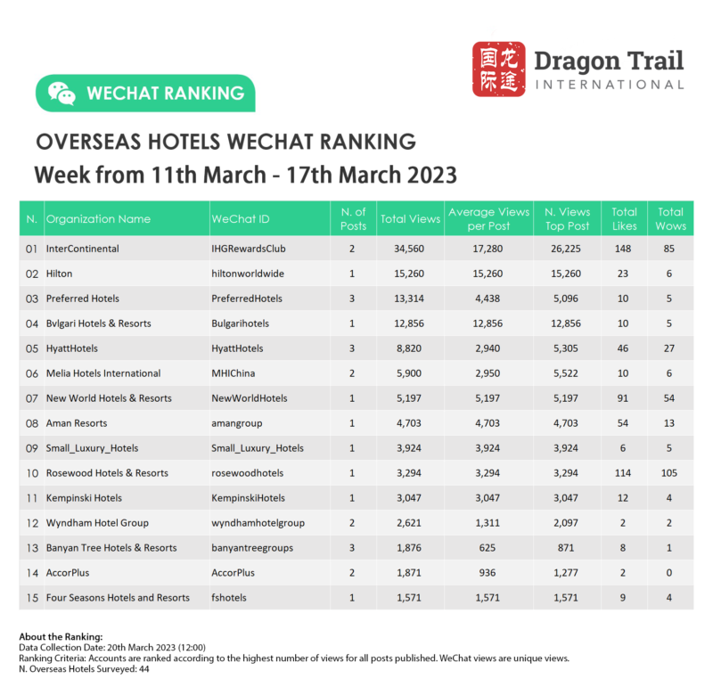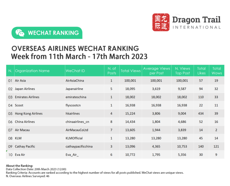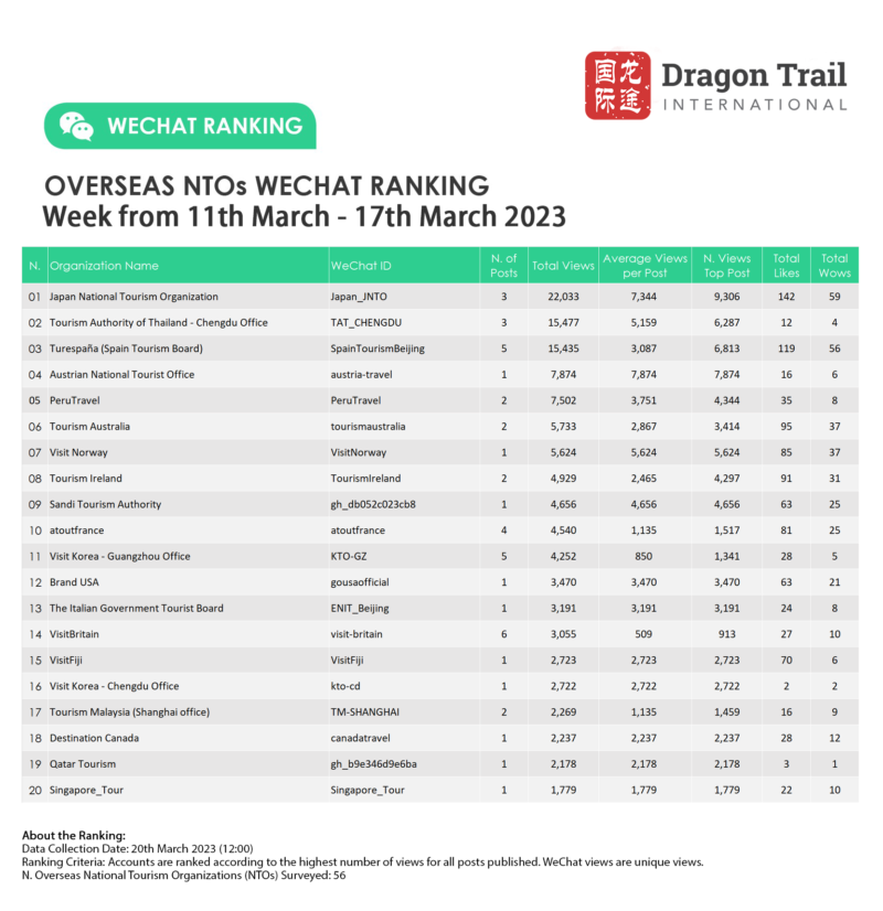 The top-ranking WeChat accounts for travel destinations, airlines, cruise lines, museums & attractions, and hotels, for the week of 11-17 March 2023.
