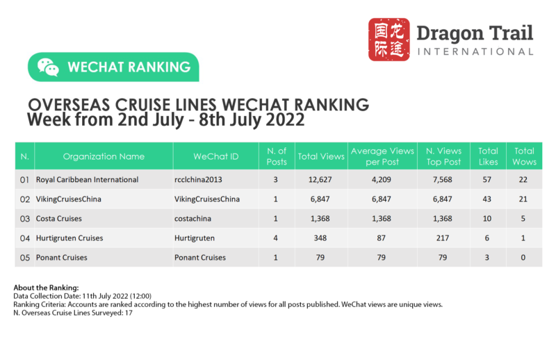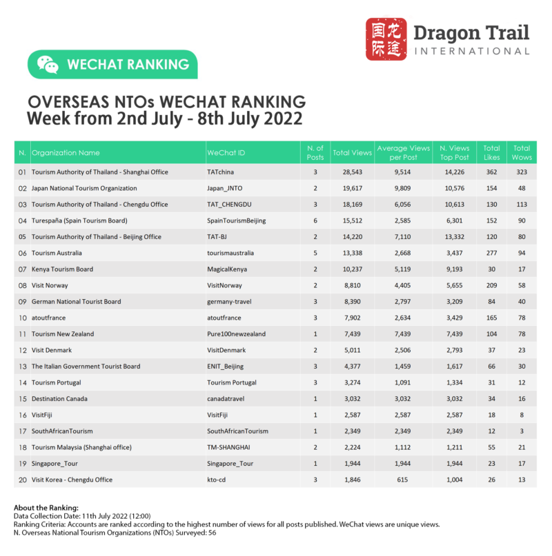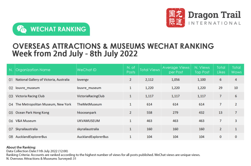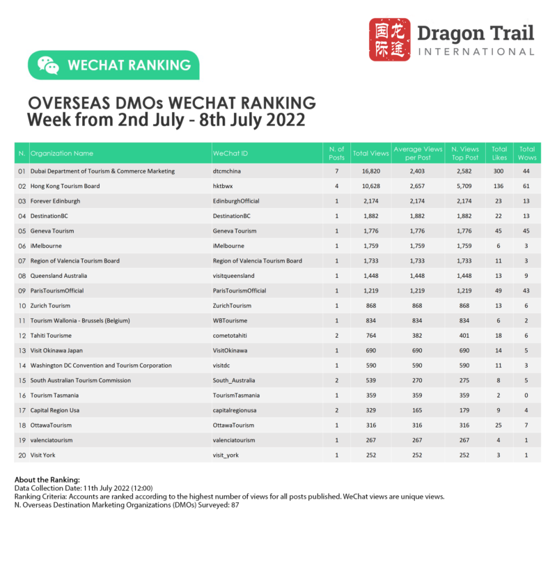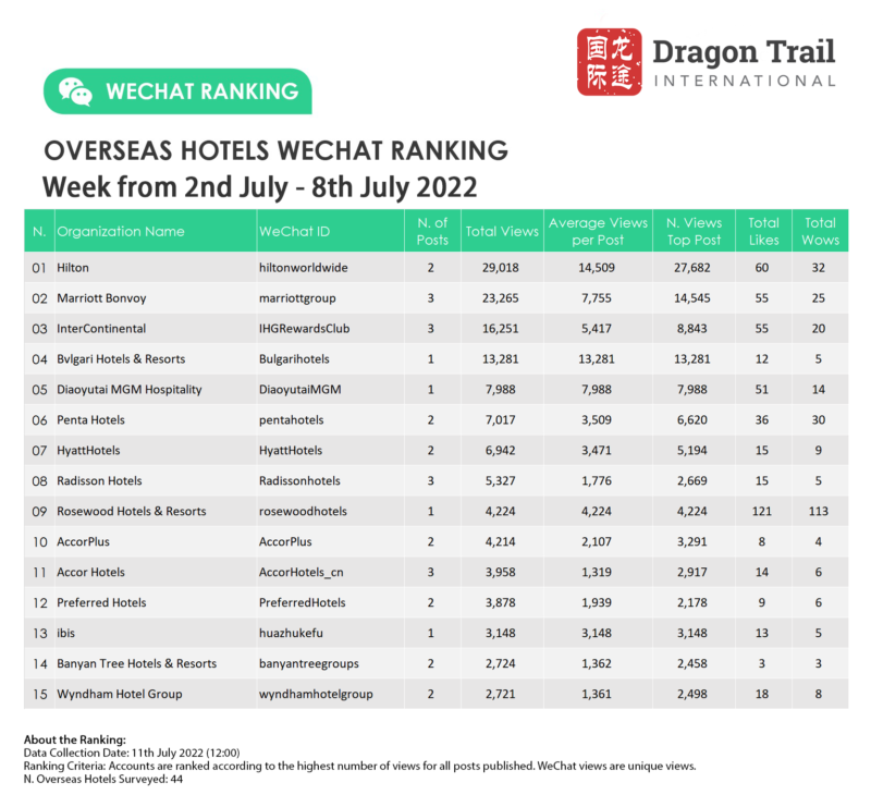 The top-ranking WeChat accounts for travel destinations, airlines, cruise lines, museums & attractions, and hotels, for the week of 2-8 July 2022.