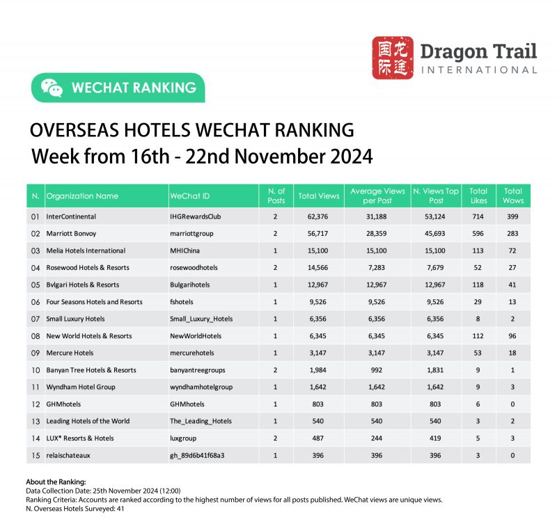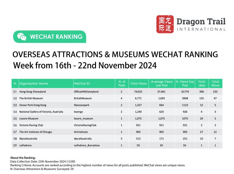 The top-ranking WeChat accounts for travel destinations, airlines, airports, cruise lines, museums & attractions and hotels for the week of 16-22 November 2024.