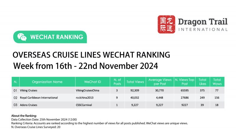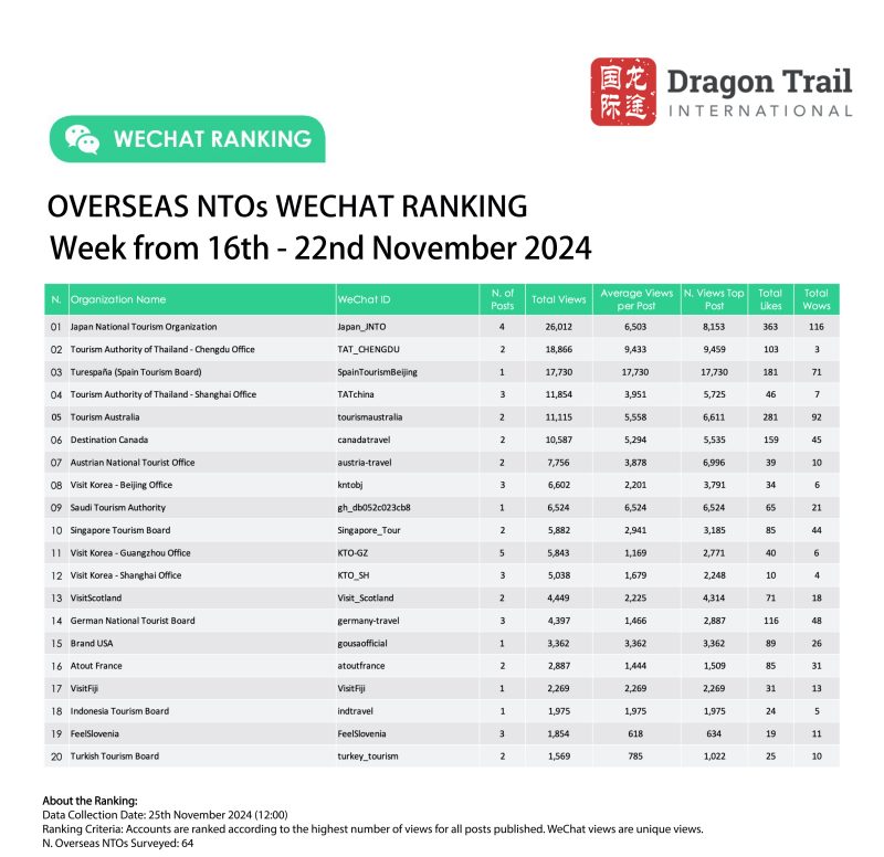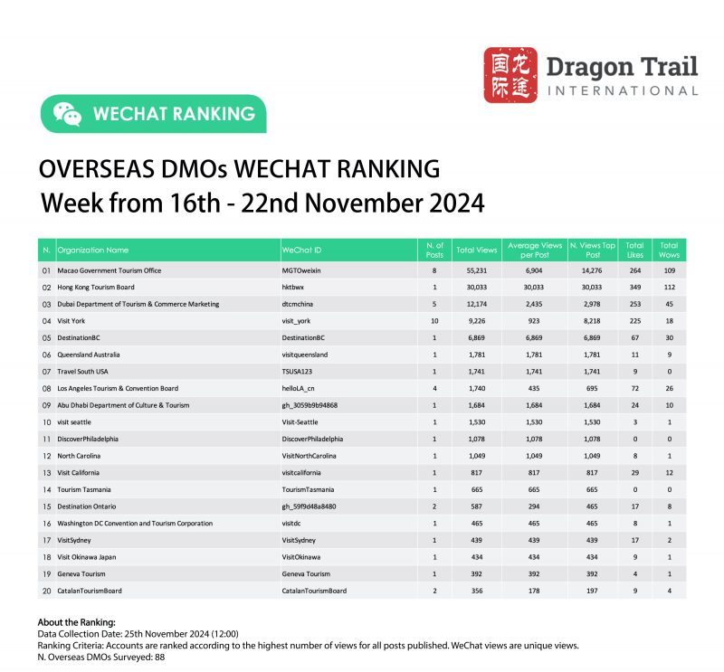 WeChat Weekly Rankings: Overseas Tourism Brands – 16-22 November 2024