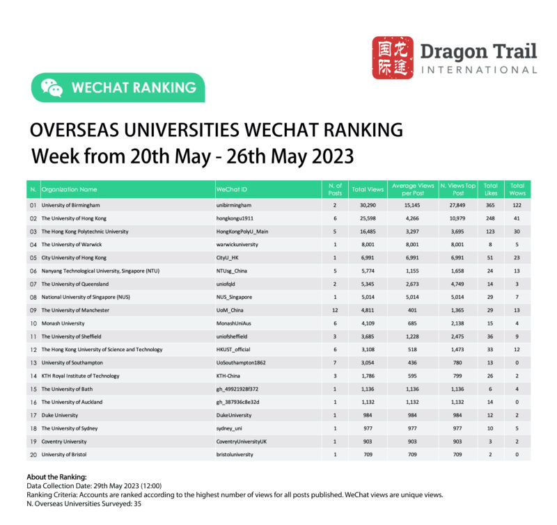 WeChat ranking criteria: Accounts are ranked according to the highest number of views for all posts published. WeChat views are “unique views”.