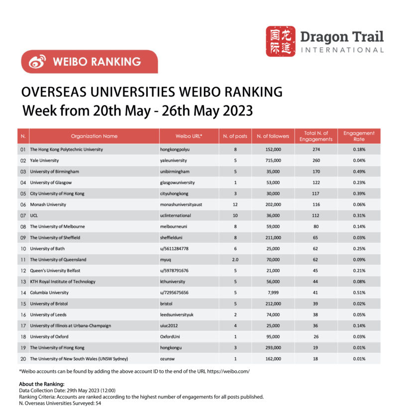 Weibo ranking criteria: Accounts are ranked according to the highest number of engagements for all posts published.