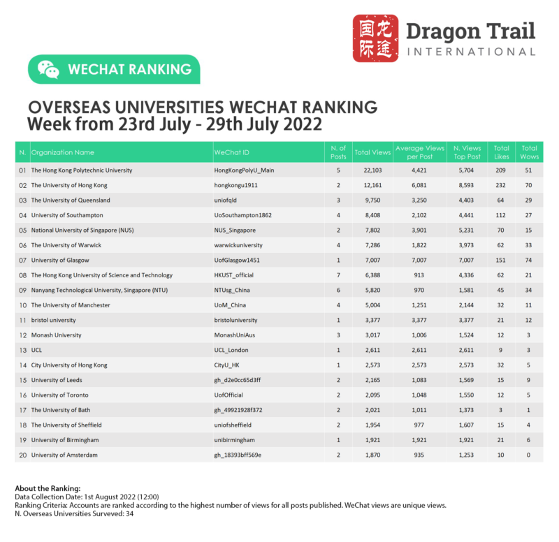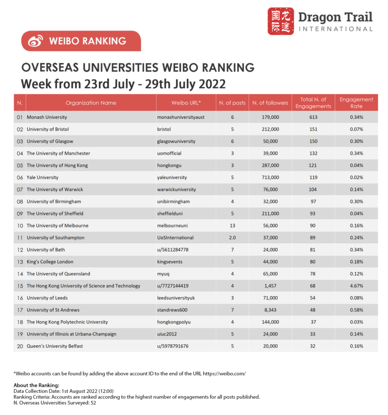 The top-ranking WeChat and Weibo accounts for overseas universities, for the week of 23-29 July 2022.