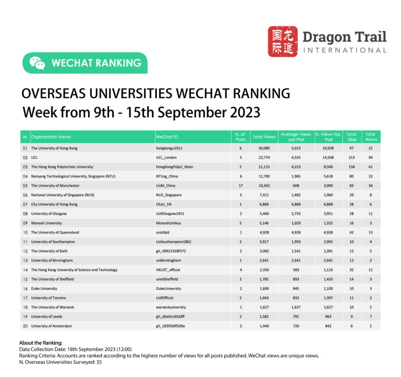 WeChat ranking criteria: Accounts are ranked according to the highest number of views for all posts published. WeChat views are “unique views”.