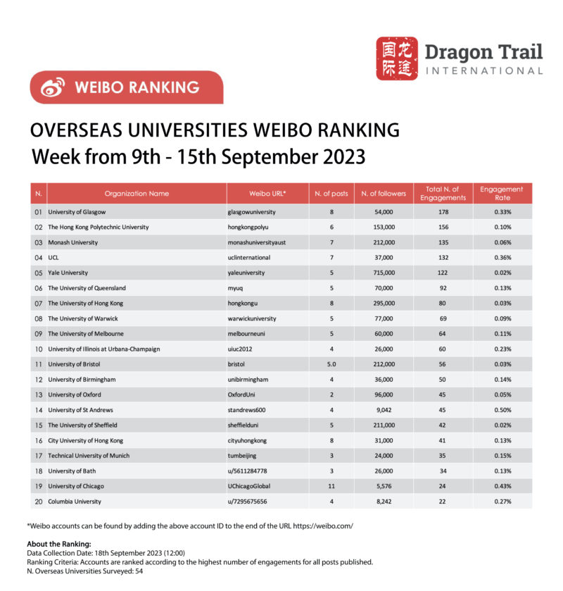 Weibo ranking criteria: Accounts are ranked according to the highest number of engagements for all posts published.