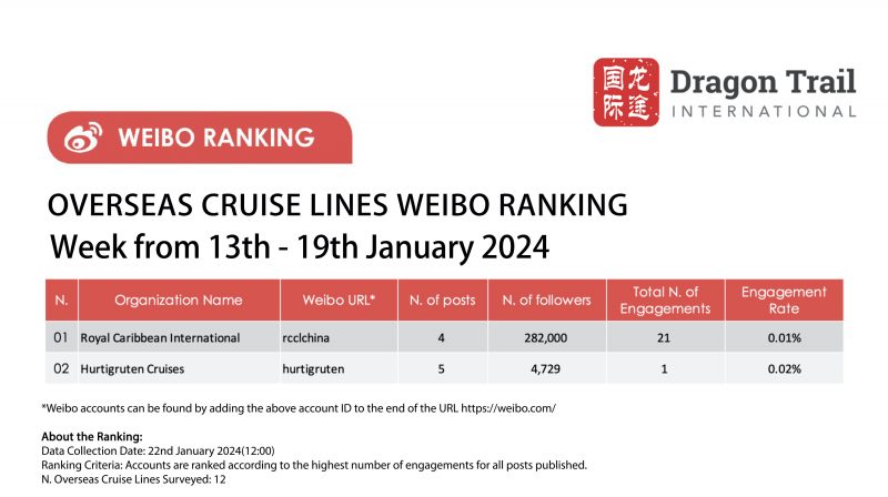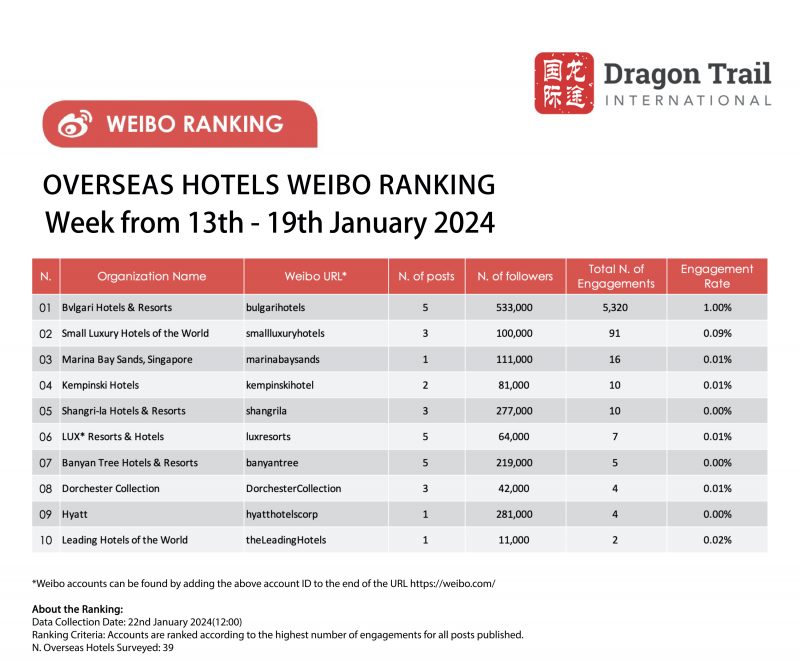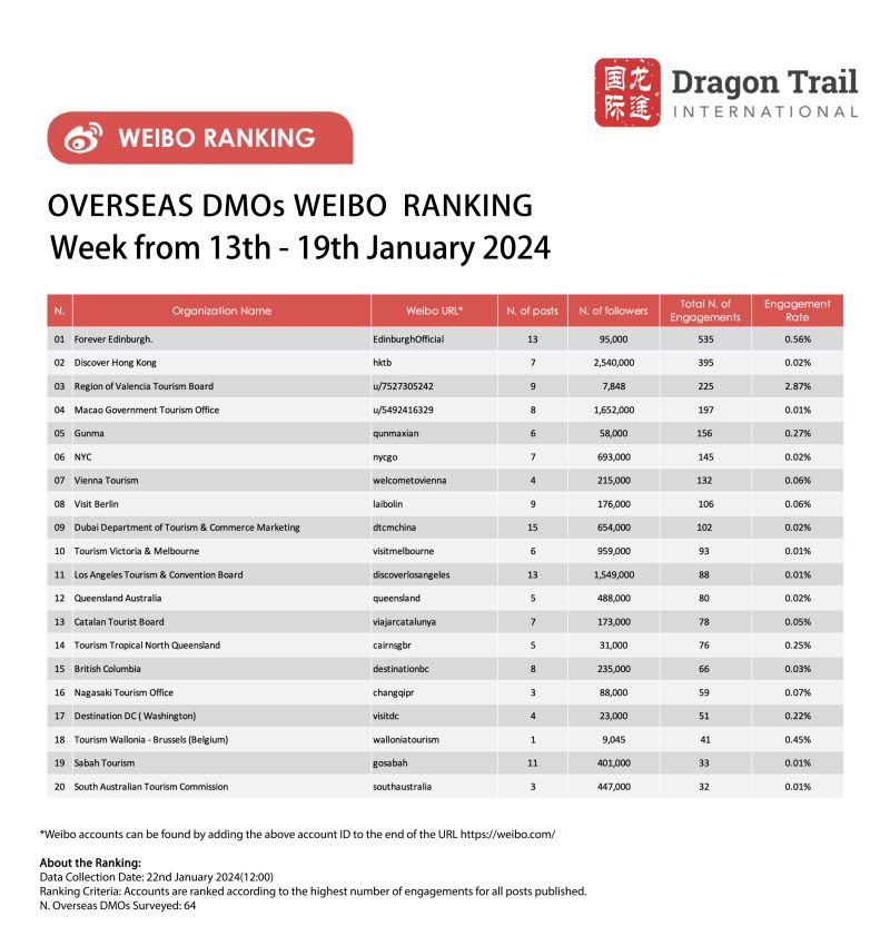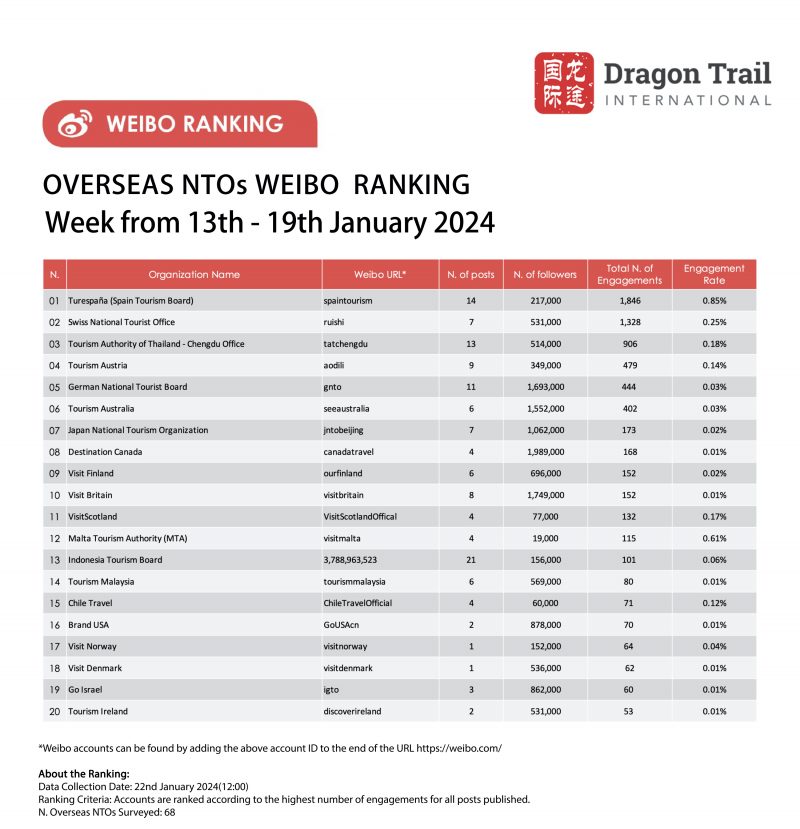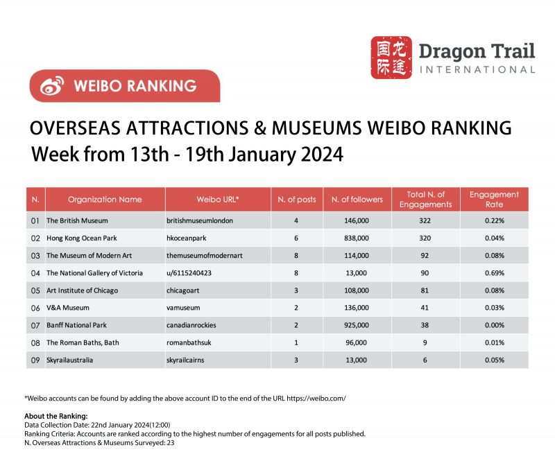The top-ranking Weibo accounts for travel destinations, airlines, cruise lines, museums & attractions, and hotels, for the week of 13-19 January 2024.