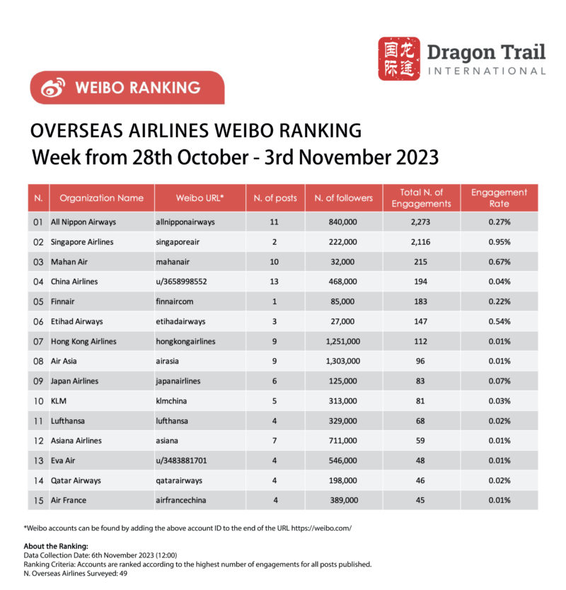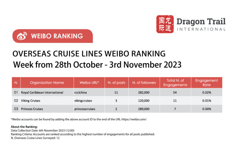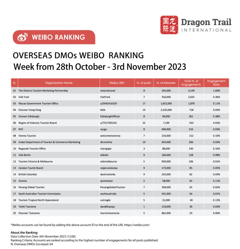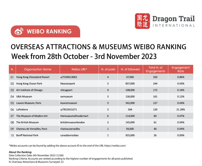 The top-ranking Weibo accounts for travel destinations, airlines, cruise lines, museums & attractions, and hotels, for the week of 28 October-3 November 2023.