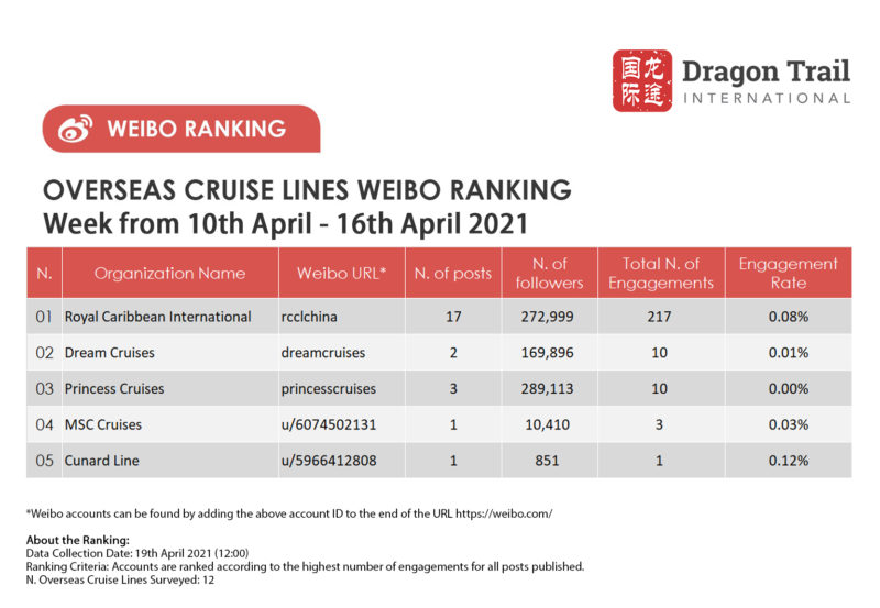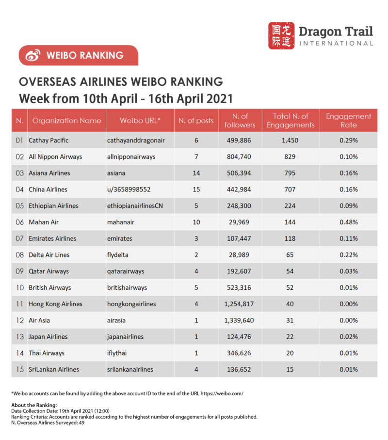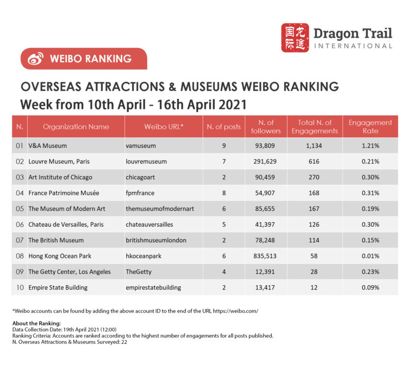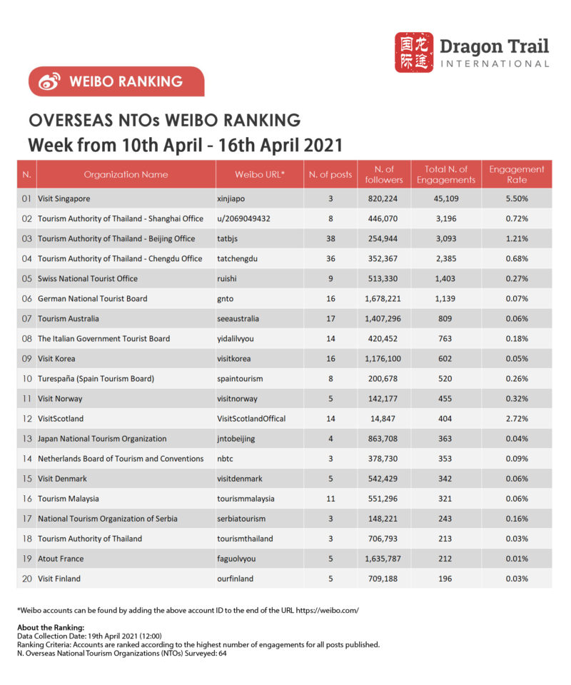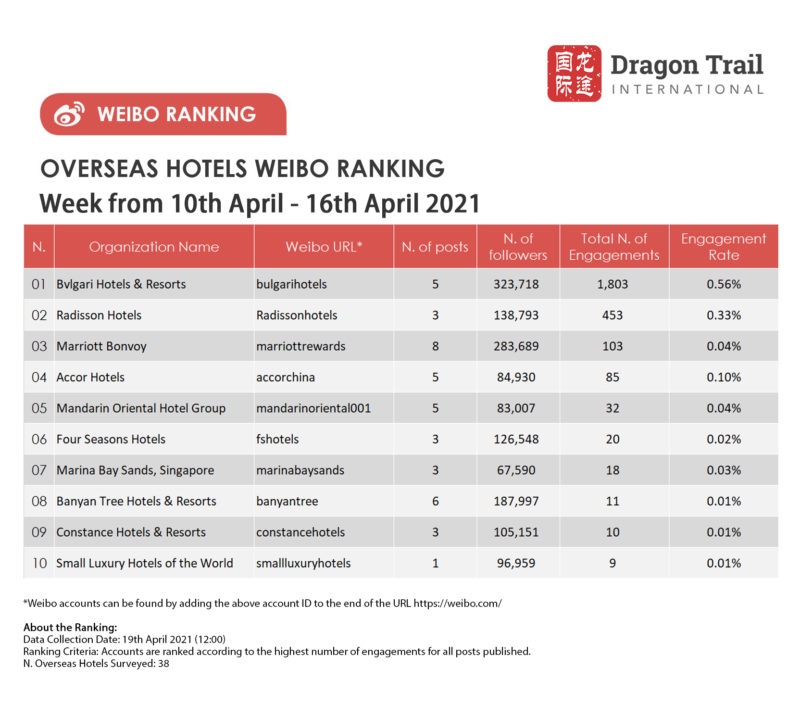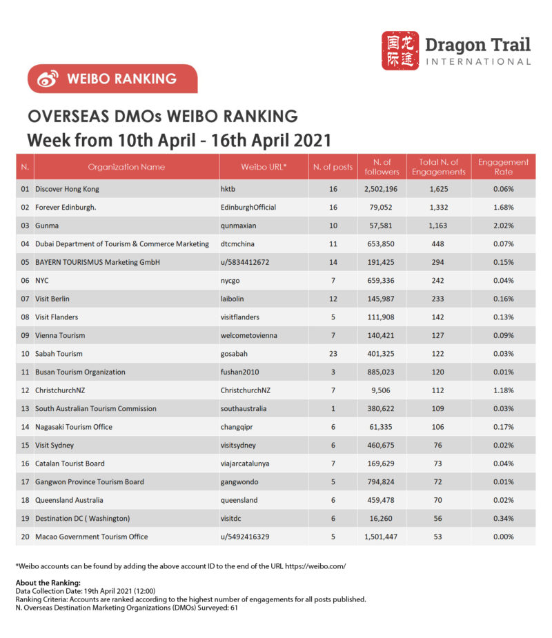 The top-ranking Weibo accounts for travel destinations, airlines, cruise lines, museums & attractions, and hotels, for the week of 10-16 April 2021.