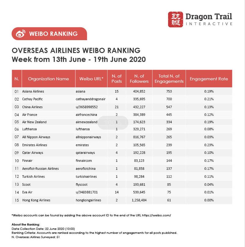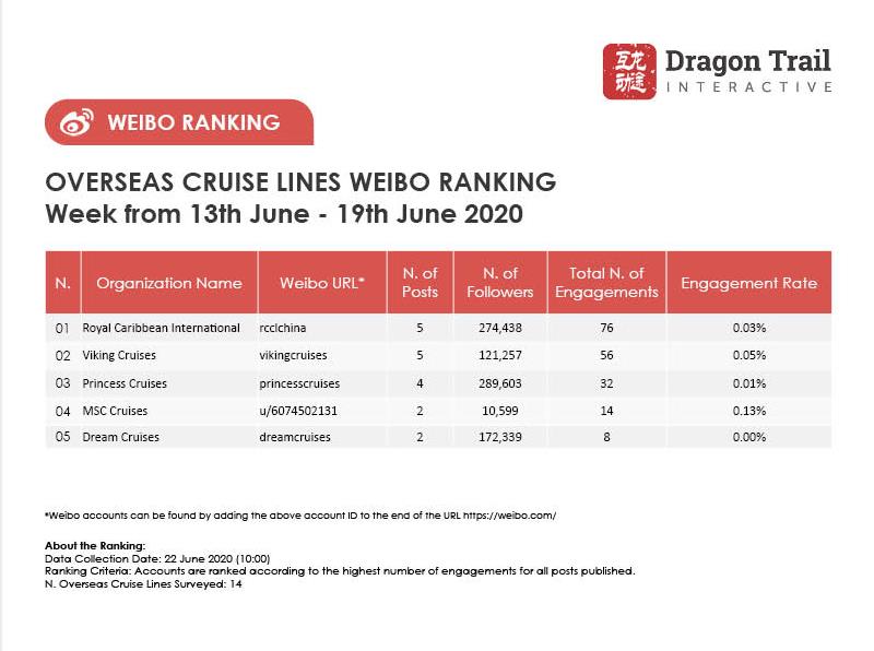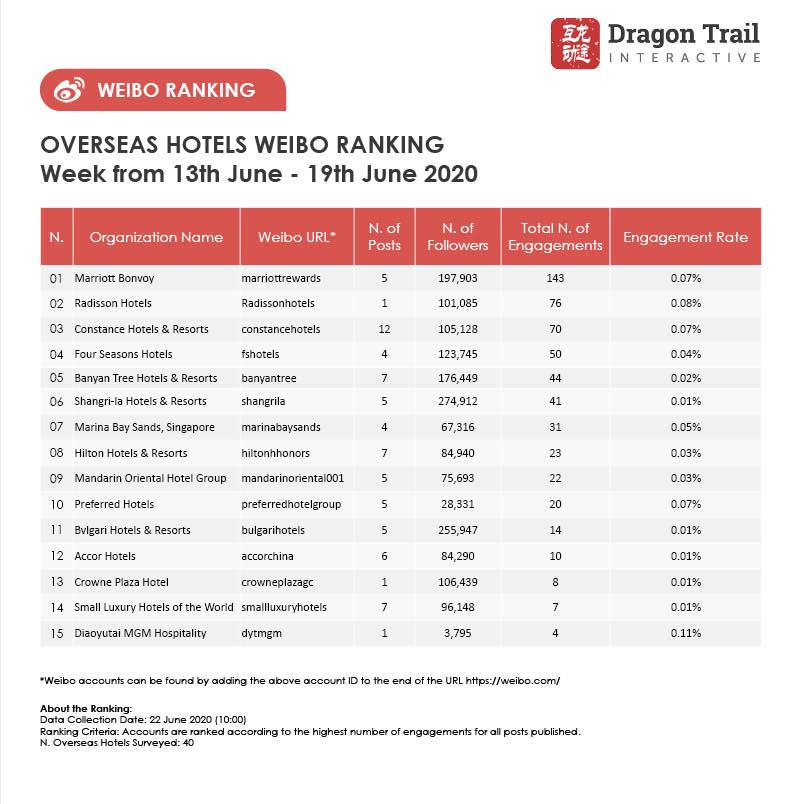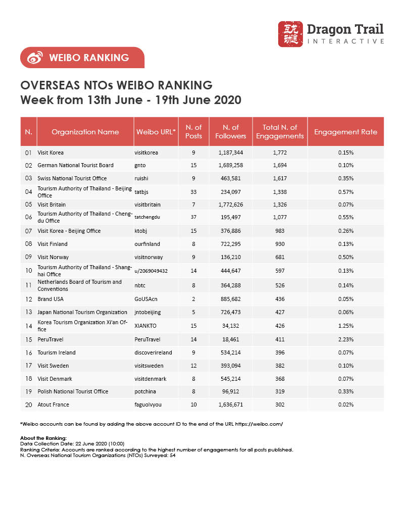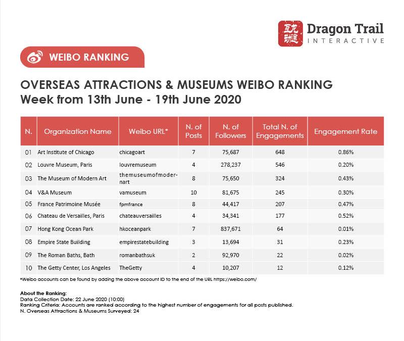 The top-ranking Weibo accounts for travel destinations, airlines, cruise lines, museums & attractions, and hotels, for the week of 13 June - 19 June, 2020.